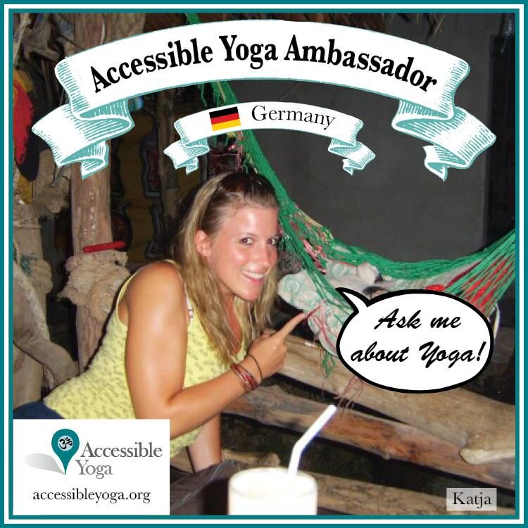 Als Inhaberin von "YOGA barrierefrei" habe ich mich im September 2015 dem internationalen Accessible-Yoga-Netzwerk angeschlossen (accessible = barrierefrei). Als Ambassador (Botschafterin) der Initiative unterstütze ich das Ziel, Yoga für jeden Menschen zugänglich zu machen - unabhängig von körperlichen Voraussetzungen.